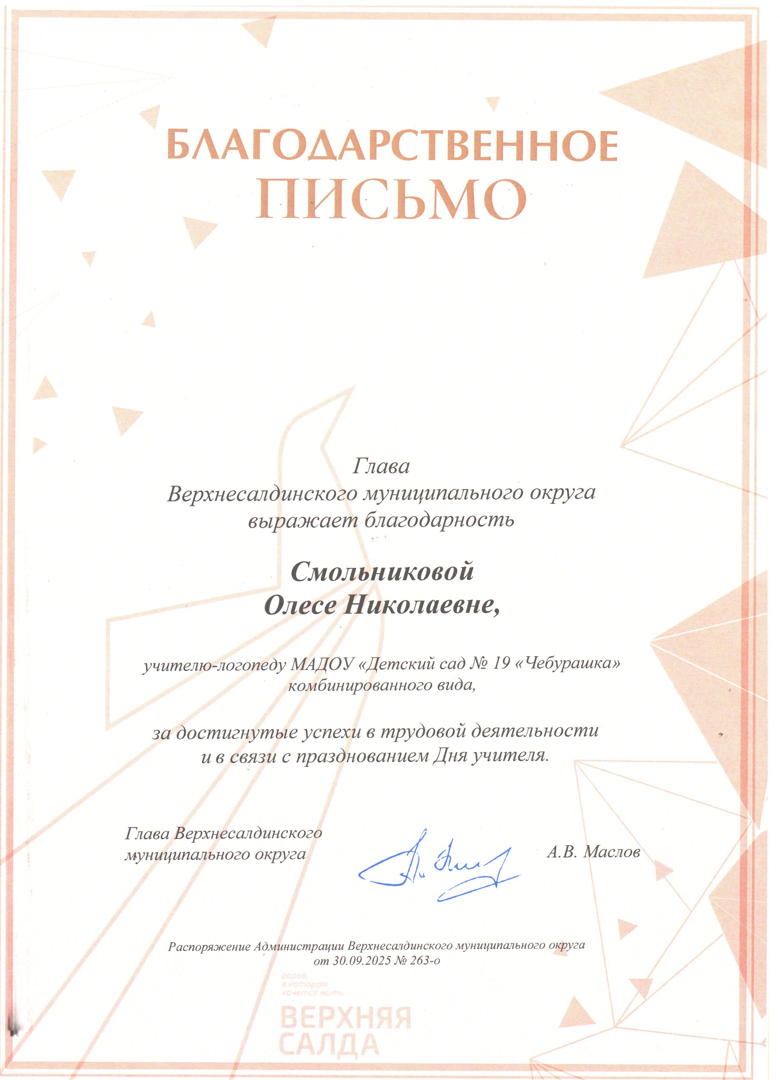 Благодарственное письмо за достигнутые успехи в трудовой деятельности